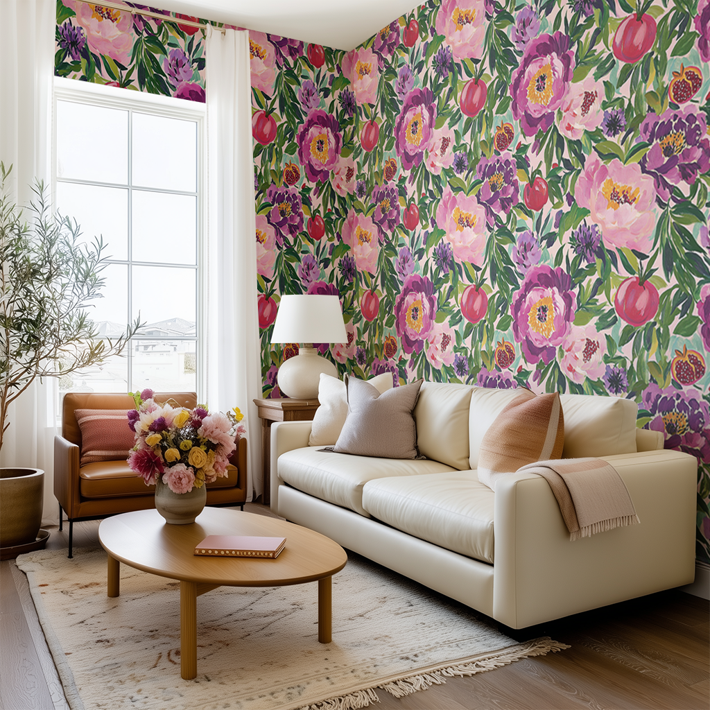 Pommes Wallpaper bursts with juicy color, showcasing bold, expressive florals in raspberry, tangerine, and lilac. The brushstroke texture gives it a modern-art-meets-garden-party vibe. This design brings playful sophistication and a confident palette to any room. It's especially striking in powder rooms, entryways, or creative spaces.