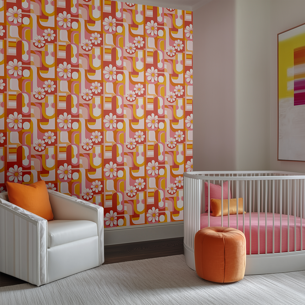A dynamic mix of abstract geometric shapes and retro florals in warm tones of orange, yellow, and pink. This eye-catching design brings a funky, mid-century modern vibe to any space.