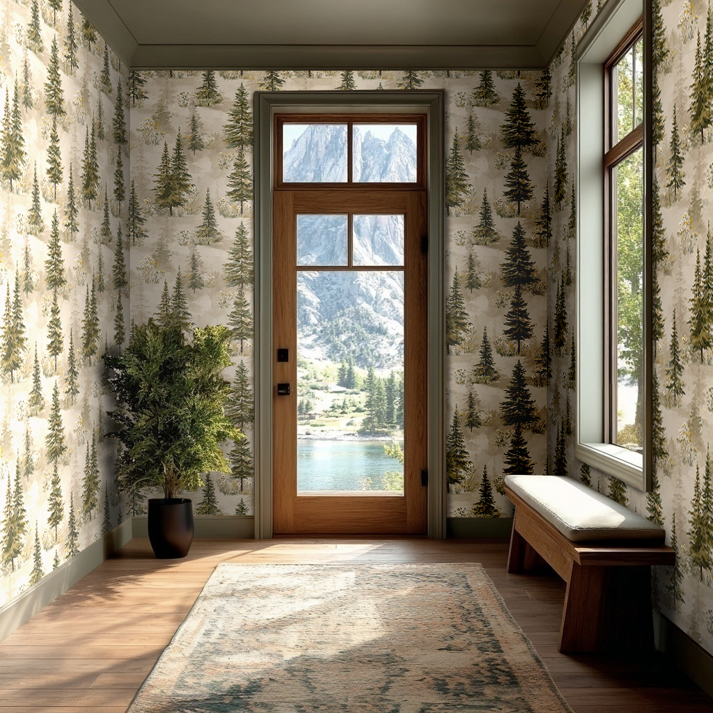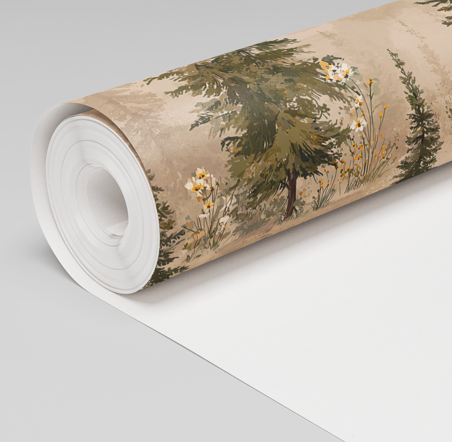 Rosalind is a woodland wallpaper with tall pines scattered among wildflowers and grasses. The soft beige background balances earthy greens and golden accents, creating a light but detailed design. Natural and versatile, it works well in both small and large spaces.