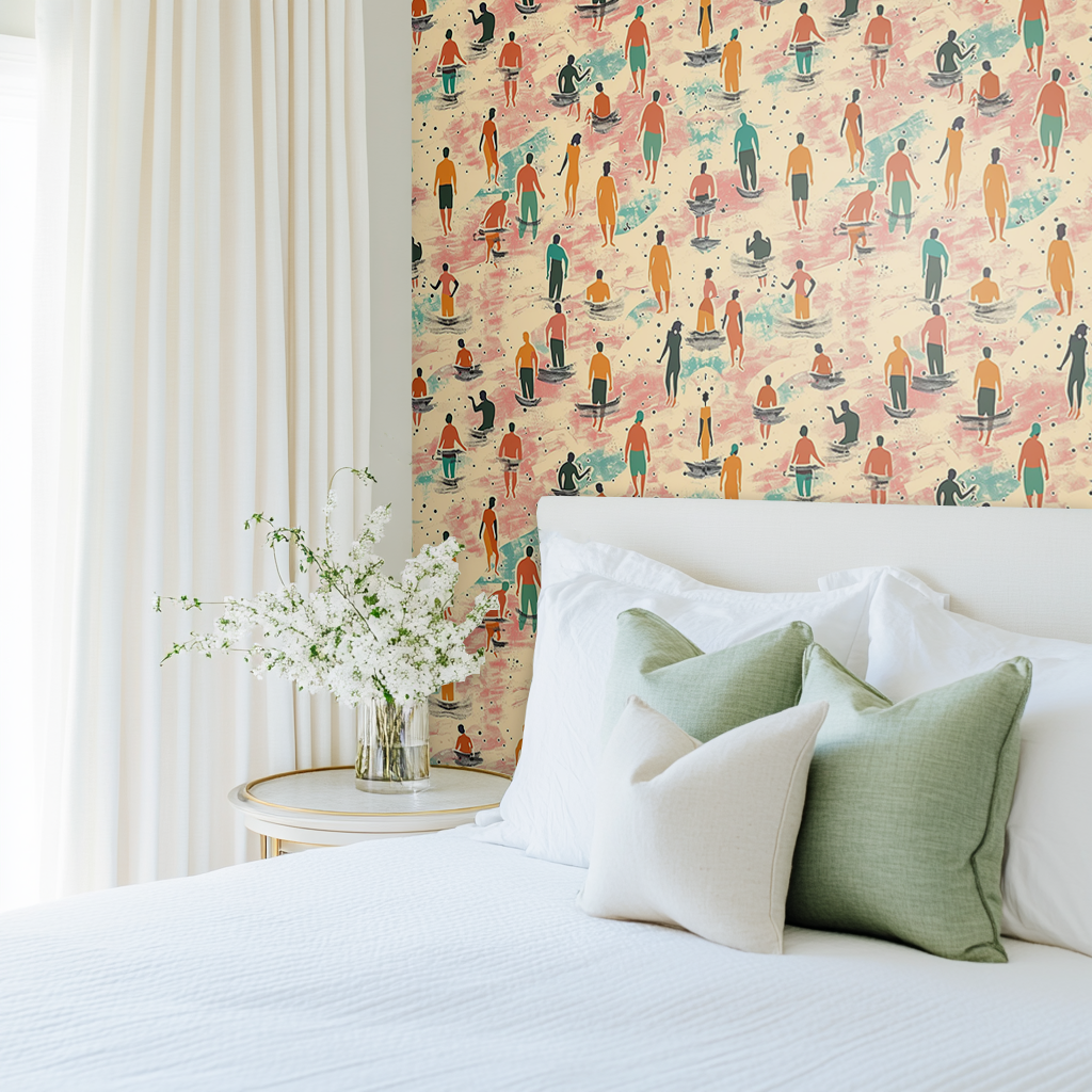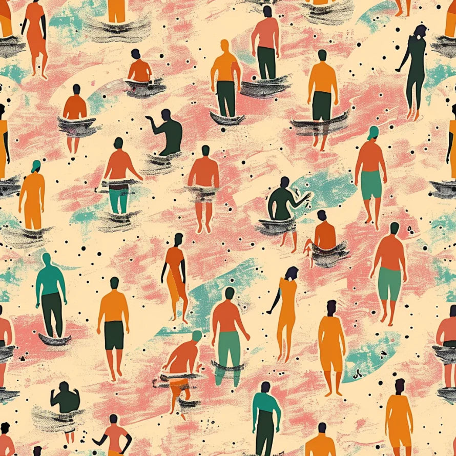 Embrace the serene vibe of a tranquil beach with 'Sandy Shores Gathering', where silhouetted figures wade in the shallows, creating a rhythmic pattern that echoes the gentle ebb and flow of coastal tides. It's perfect for those who find solace in the simplicity and community of seaside living.