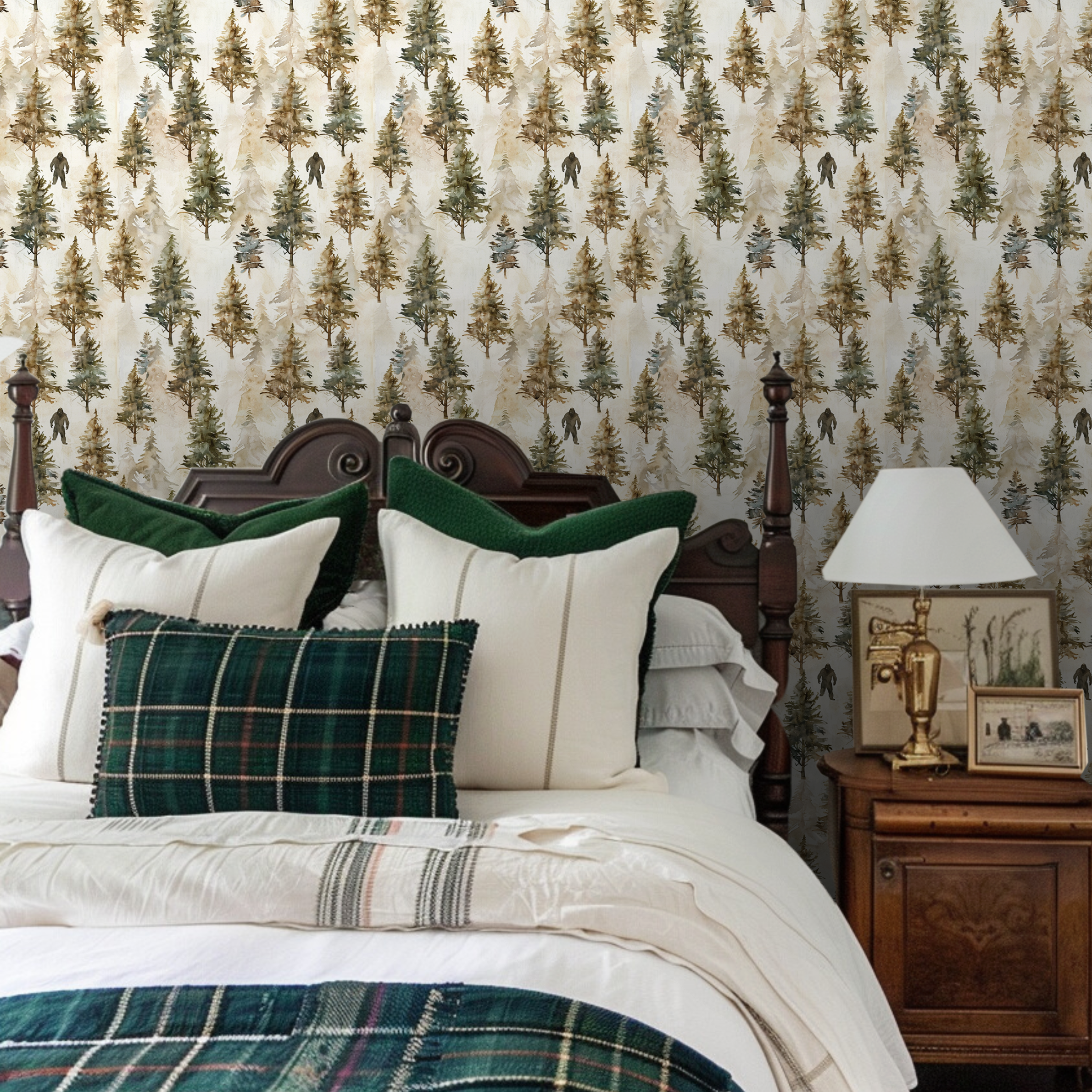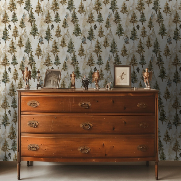 Peek-a-Boo Bigfoot: In this whimsical wallpaper, a sly sasquatch plays hide and seek among soft, watercolored pines, offering a playful twist to your wall decor. Keep your eyes peeled, he's quite the master of disguise!