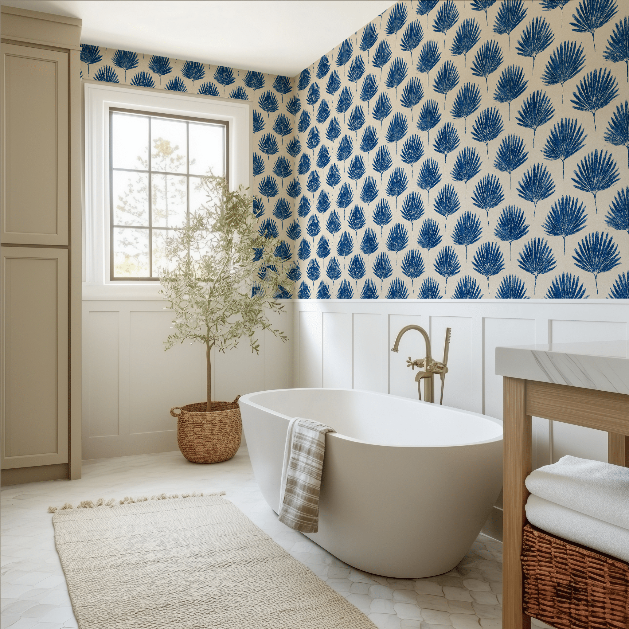 Seabreeze Palm makes a bold coastal statement with fan palms in deep indigo. The playful scale and vibrant color breathe energy into a room, striking the balance between tropical flair and modern edge.