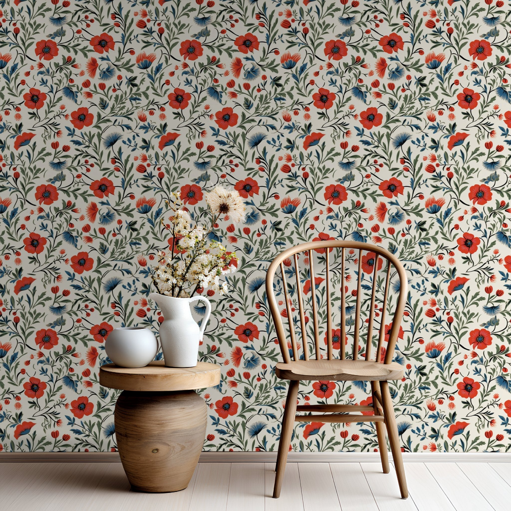 Elevate your interiors with our Shiloh Floral Wallpaper. This vibrant floral wallpaper features a design with bold red poppies, delicate blue thistles, and soft green foliage on a light cream background. Perfect for adding a touch of timeless elegance and natural beauty to any space, the intricate details and harmonious color palette create a fresh, artistic vibe. Ideal for accent walls, living rooms, or bedrooms, this wallpaper transforms interiors into serene, garden-inspired sanctuaries