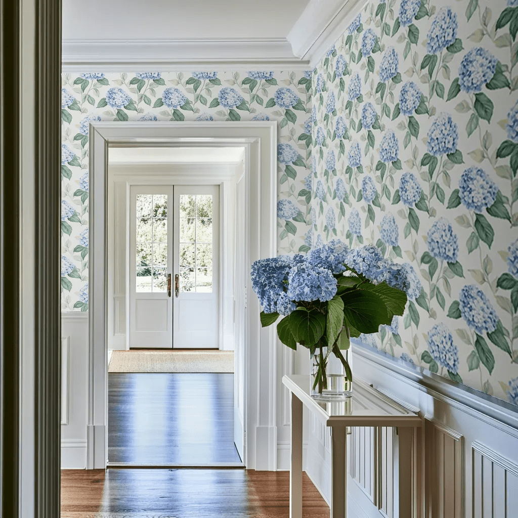 Transform your walls with the timeless charm of our Skylark Bloom wallpaper. Featuring delicate watercolor-style blue hydrangeas paired with soft green leaves, this design brings a refreshing and uplifting feel to your space. Ideal for kitchens, bedrooms, or any room that thrives on natural light and a cheerful atmosphere.