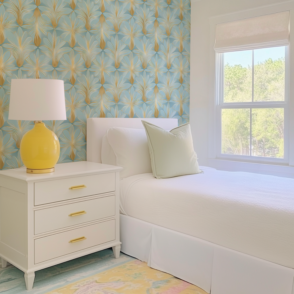 A light blue base sets the tone for this airy gold floral print. Skylight Gold feels soft, open, and full of movement—ideal for brightening bedrooms, baths, or quiet corners of the home.