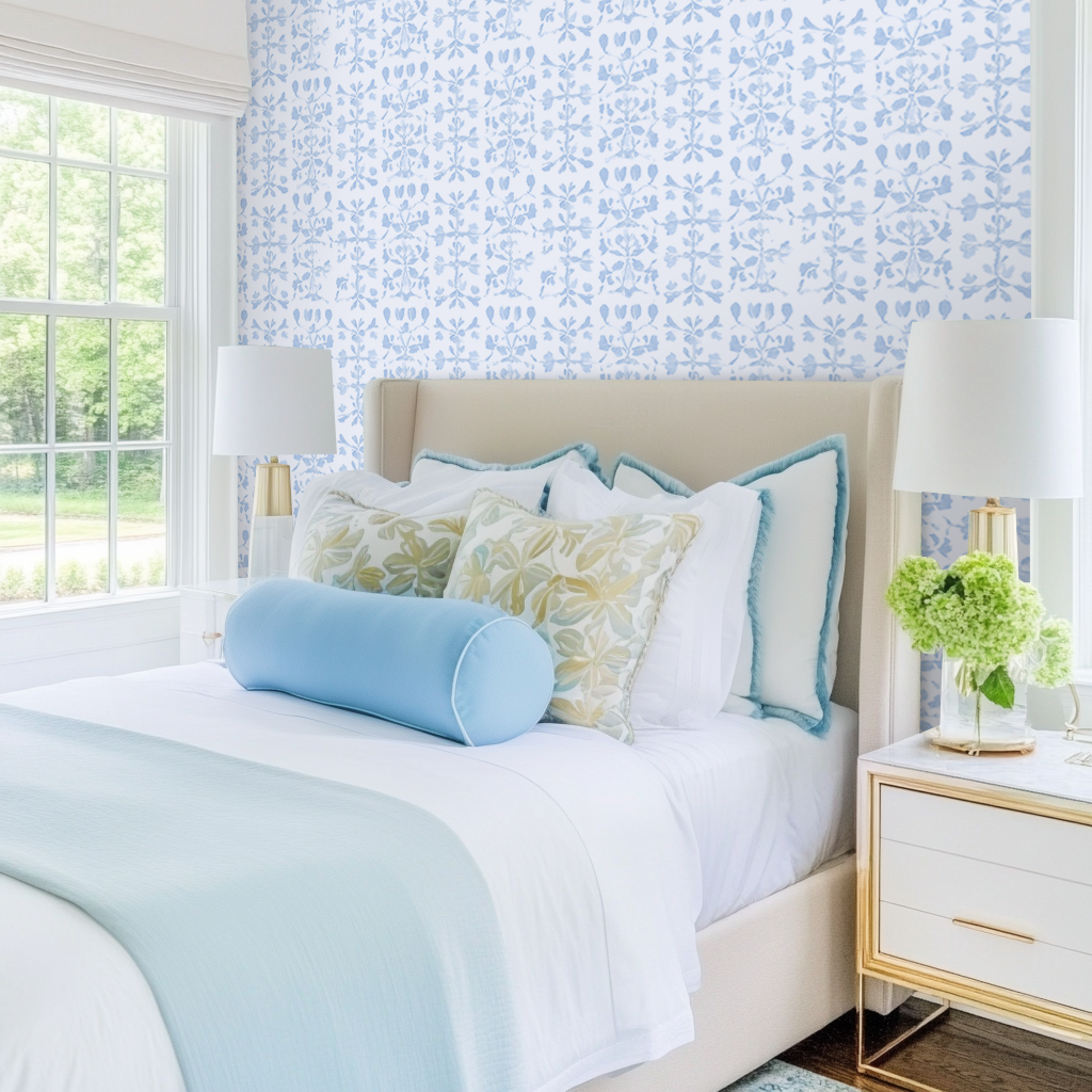 Snow at the Beach is soft and serene, like watercolor petals caught in the breeze. With its light blue hues and hand-painted feel, it’s a subtle statement that brings calm and quiet beauty to the room.