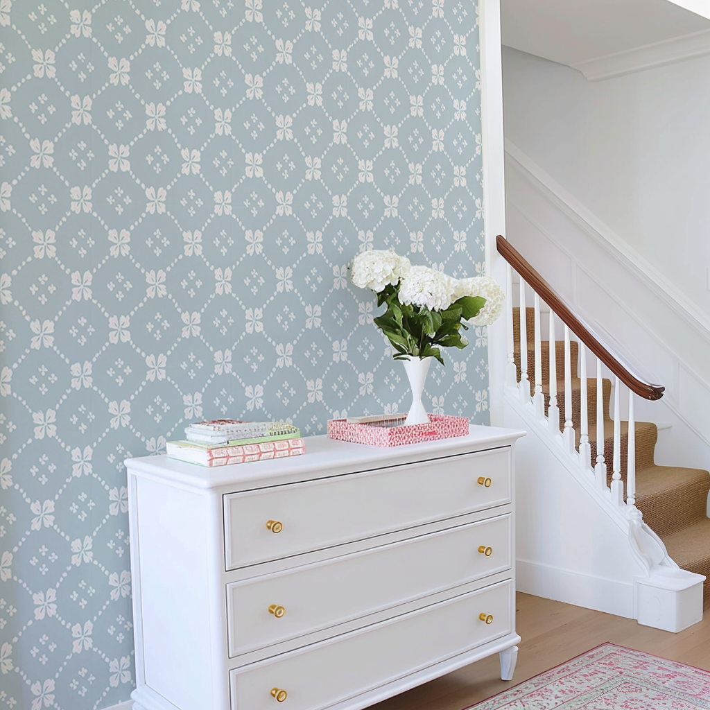 Softly sketched florals form a diamond lattice across a dusty blue backdrop, creating a look that’s both polished and playful. With its hand-painted charm and subtle pink accents, this wallpaper brings timeless sweetness to entryways, bedrooms, and beyond.