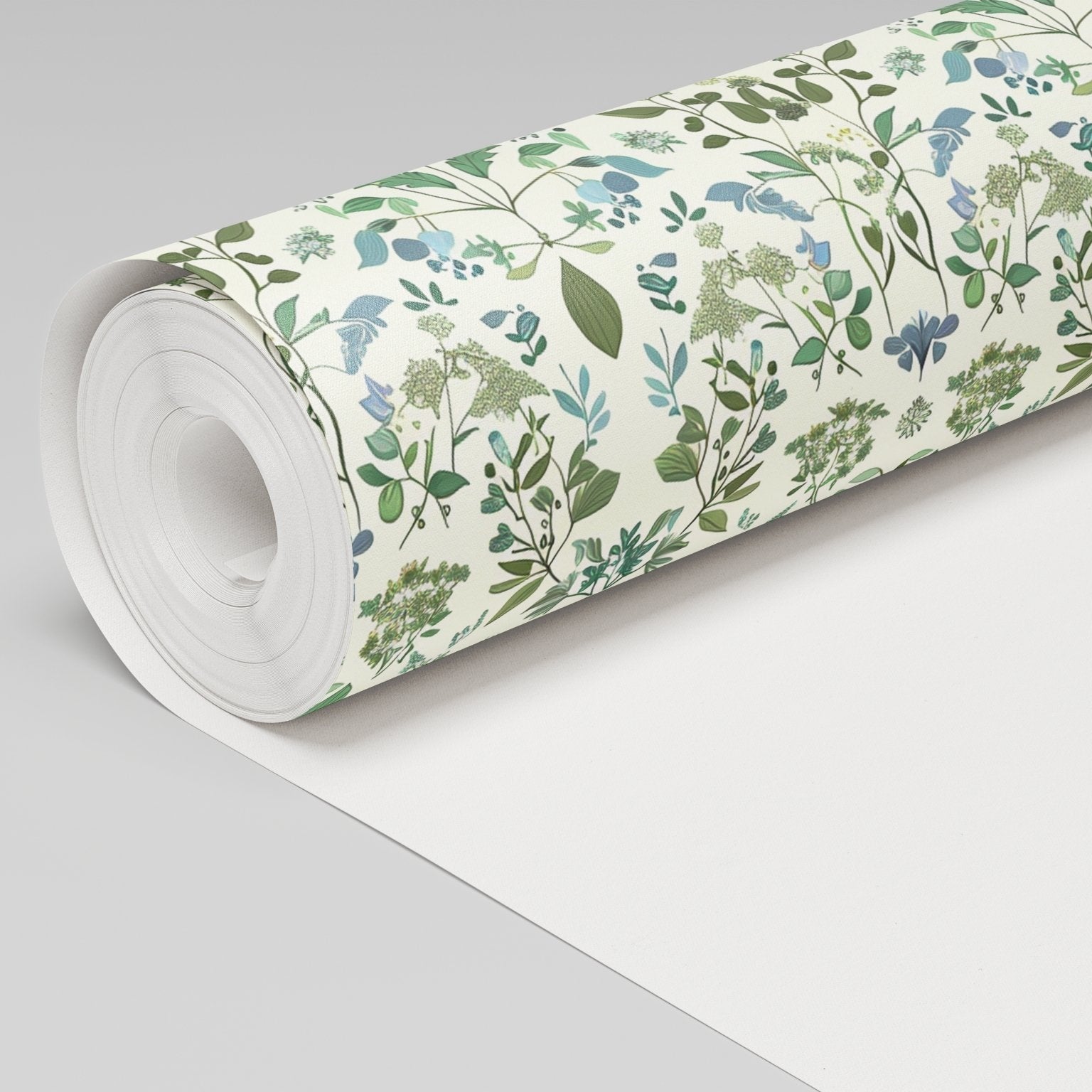 Our Stevie Wallpaper showcases a delicate pattern of wildflowers and foliage in soft greens and blues on an off-white background. The gentle colors and intricate design evoke a sense of natural serenity and charm. Perfect for those who covet a blend of vintage charm and modern chic, this design transforms any space into a sophisticated botanical retreat. Durable, easy to apply, and striking in every way, it's the ideal choice for a statement wall or a full-room ensemble. ÂÂ
