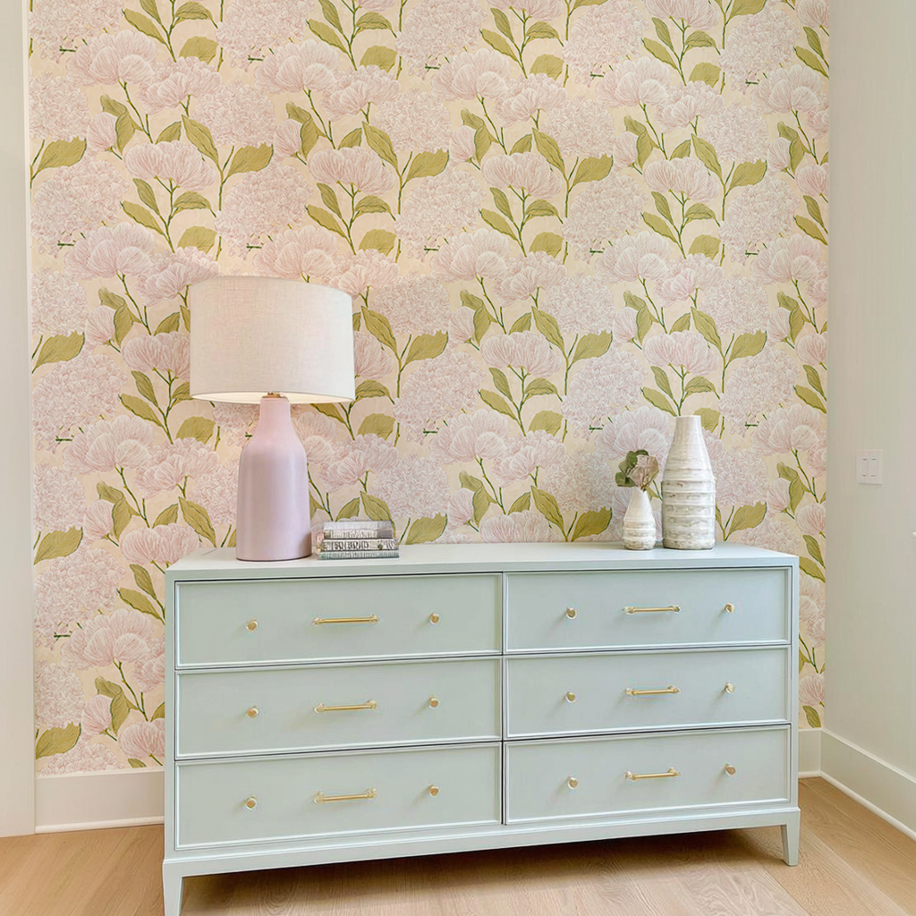 Sunday Light wallpaper brings delicate femininity to your interiors with pastel pink hydrangeas gently outlined in sage green. Resting on a creamy background with faint floral whispers, this pattern radiates warmth and charm—like morning light filtering through sheer curtains. Ideal for sophisticated nurseries, sunrooms, or romantic master bedrooms, it offers a subtle yet sumptuous statement of grace.