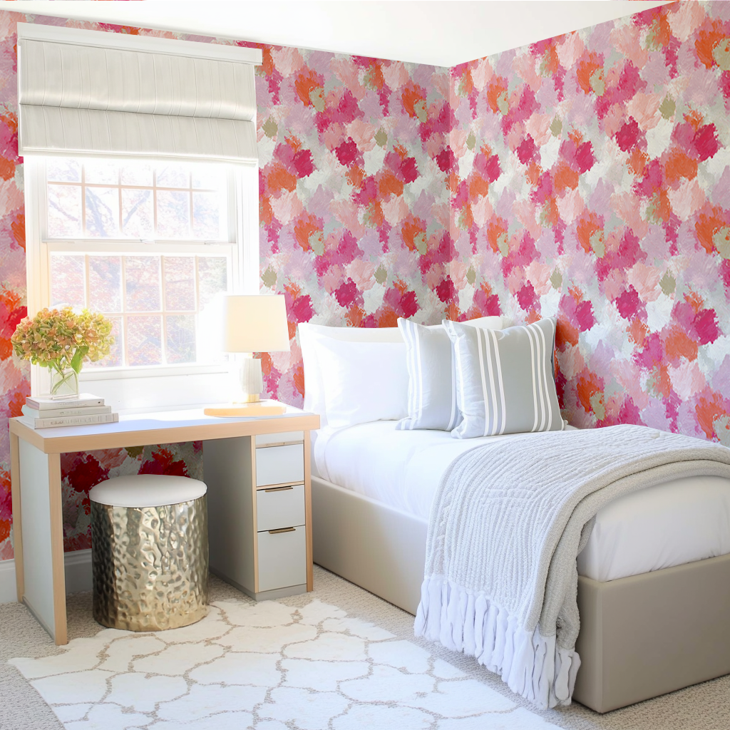 An abstract blend of pinks, corals, lilacs, and neutrals swirls across the canvas in a painterly, textural pattern. A bold yet soft design that feels artistic and one-of-a-kind.