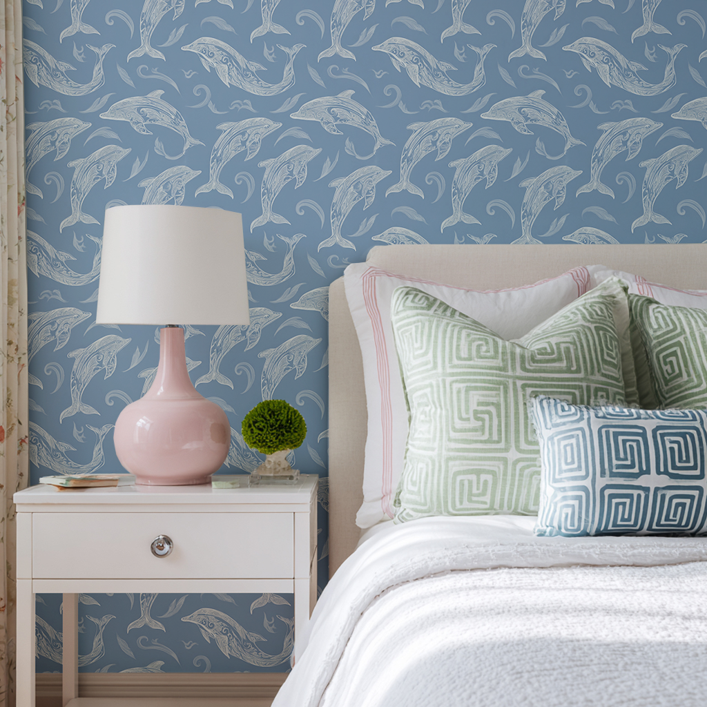 Swim with Dolphins features softly drawn dolphins gliding across a dusty blue background. Peaceful and a little dreamy, this print is perfect for beach houses, playrooms, or anywhere you want to bring in a sense of calm.