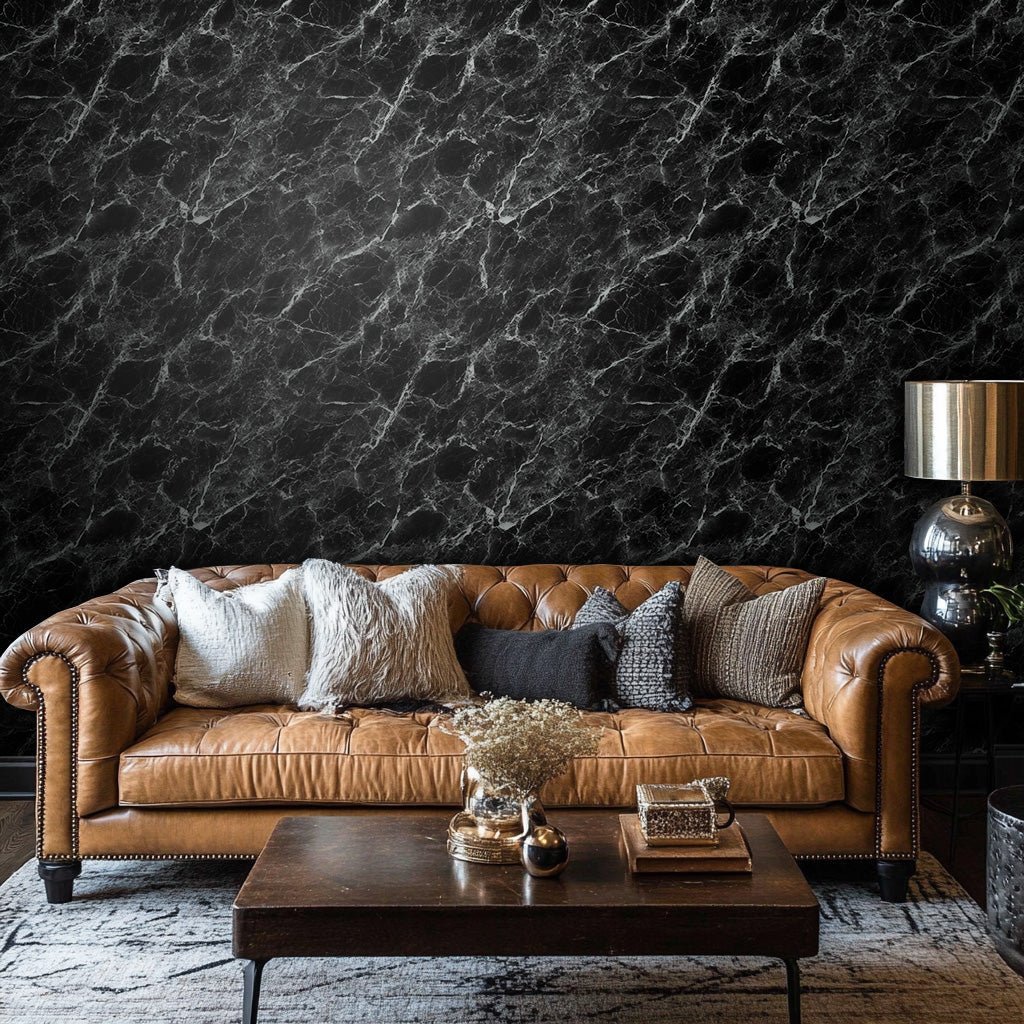 This black marble-inspired wallpaper features intricate white veining, offering a sophisticated and timeless look. Its luxurious texture and high-contrast palette make it a versatile choice for modern interiors. Use it in kitchens, bathrooms, or entryways to add a touch of refinement and drama. Classic yet contemporary, it transforms spaces with effortless style.