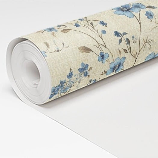 The Tabitha Wallpaper features a delicate pattern of soft blue blossoms and slender branches, gracefully scattered across a light beige, linen-textured background. The airy floral design adds a soothing, fresh feel, perfect for creating a serene atmosphere in any space. Ideal for bedrooms, living rooms, or even a cozy reading nook, this wallpaper brings a light and timeless charm to your decor. A lovely choice for those who want a peaceful, nature-inspired look.