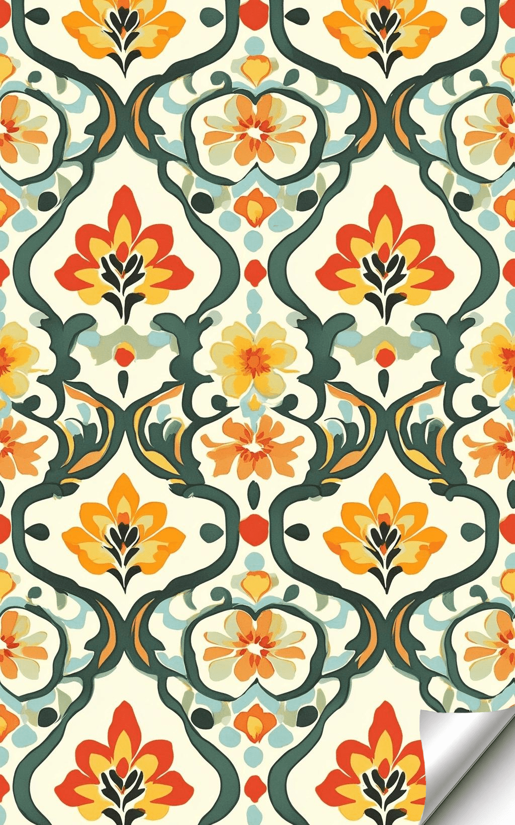 Thatcher brings a bold, sun-warmed energy to your walls with vibrant florals framed by flowing, symmetrical lines. Inspired by Mediterranean tile work, its rich palette of saffron, teal, and coral transforms any space into a lively, artful retreat.