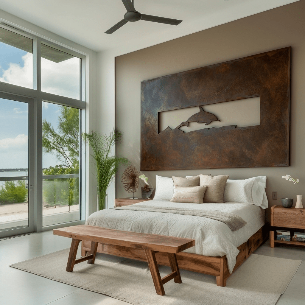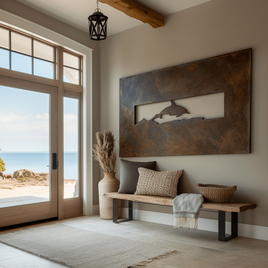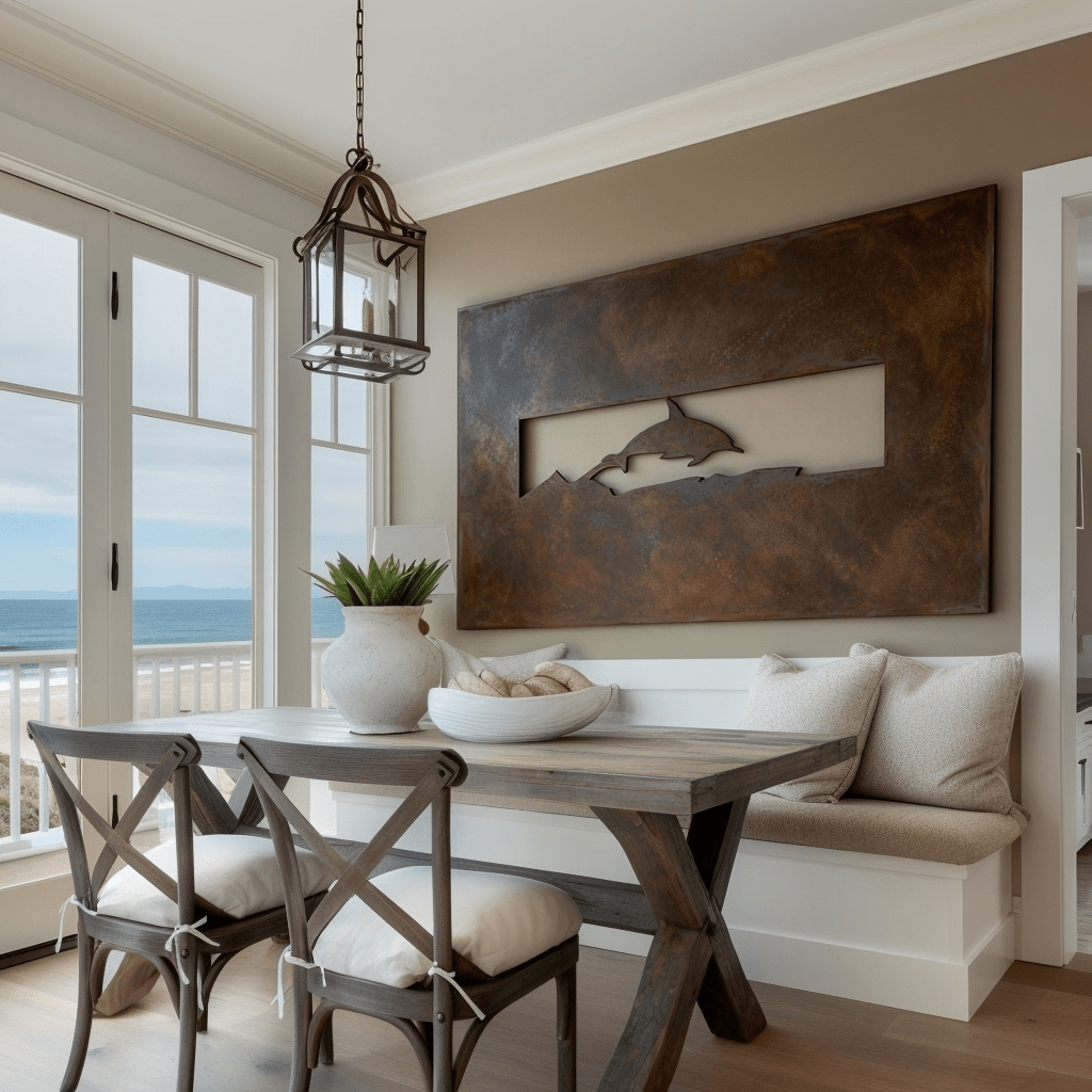 A dynamic silhouette of a leaping dolphin arcs above stylized waves, framed in a wide horizontal cutout. The Breakerconveys the energy and fluid motion of the ocean, pairing clean lines with the raw texture of weathered steel.