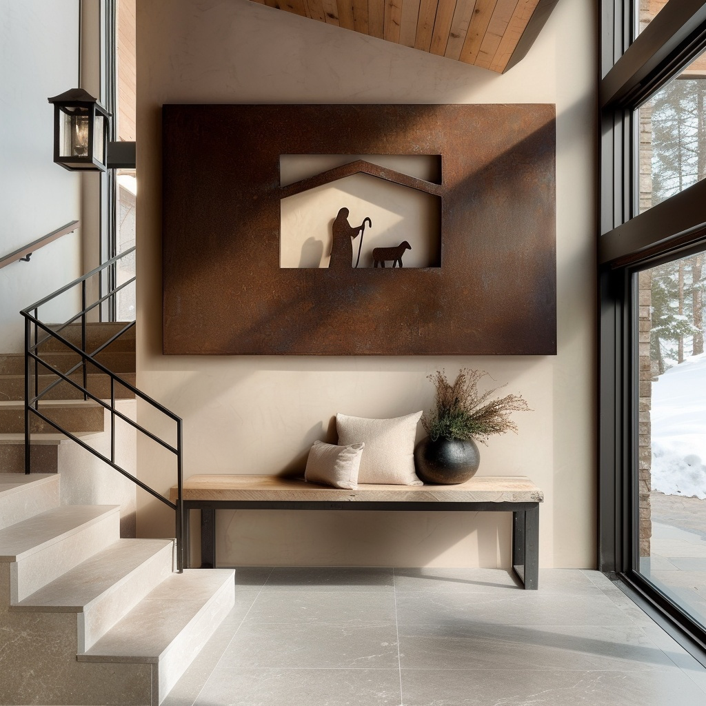 Simple and still, The Good Shepherd shows a quiet figure beneath a pitched roof, staff in hand, watching over a single sheep. It’s a moment of care, cut from steel.