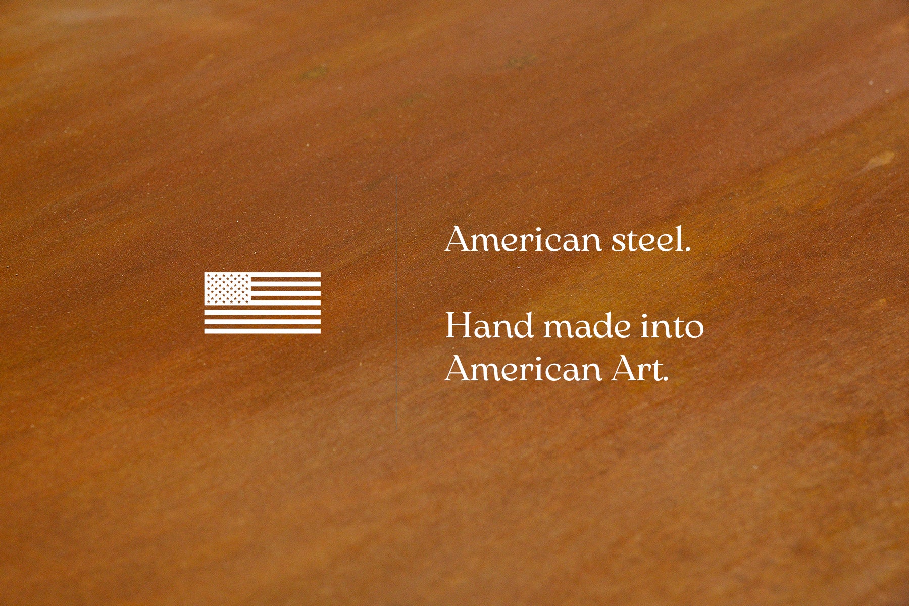 Each piece is crafted from solid 14-gauge American steel and precision cut for clean, lasting lines. A hand-applied patina gives every piece its own unique character. No two are exactly alike. Once finished, the piece is sealed for long-term durability.