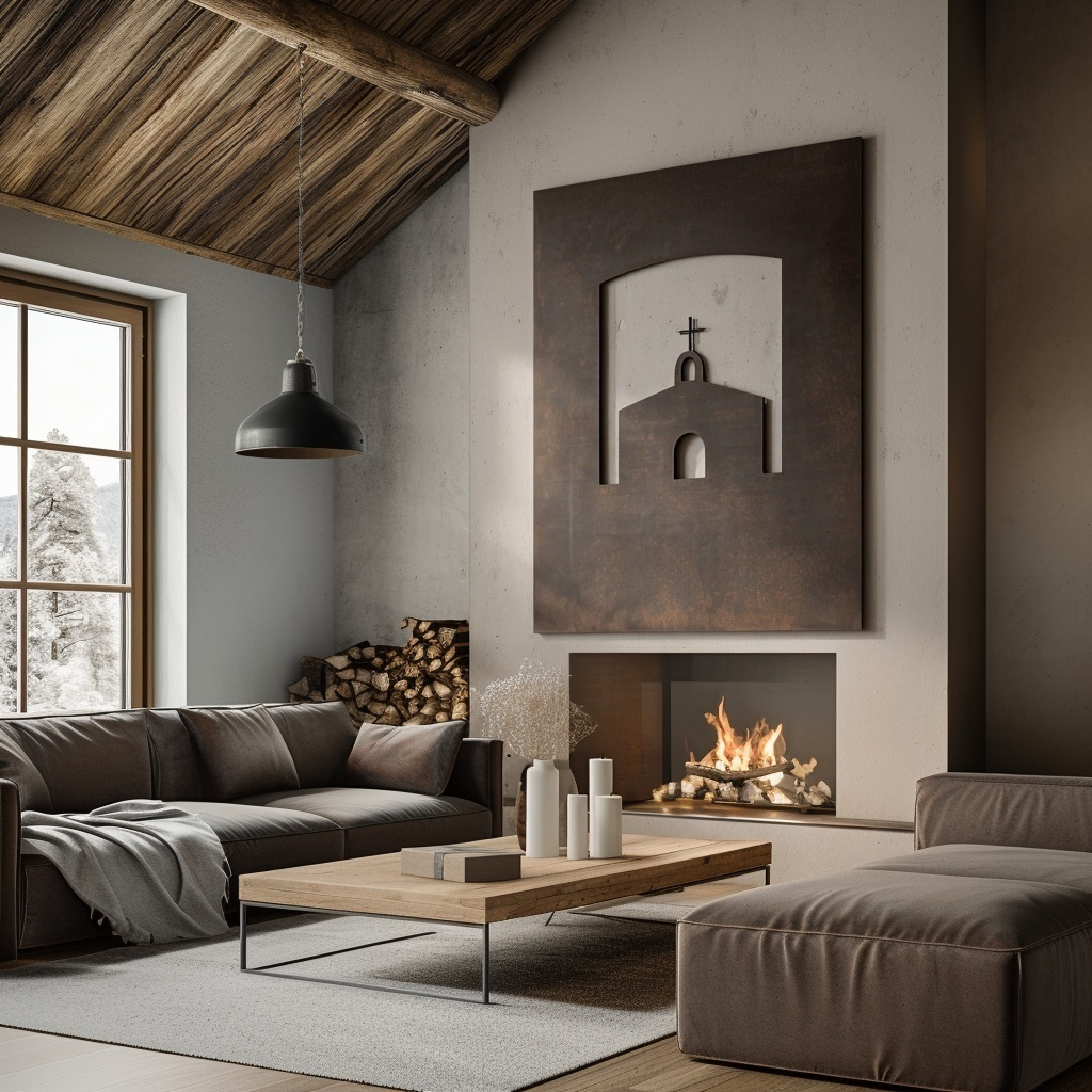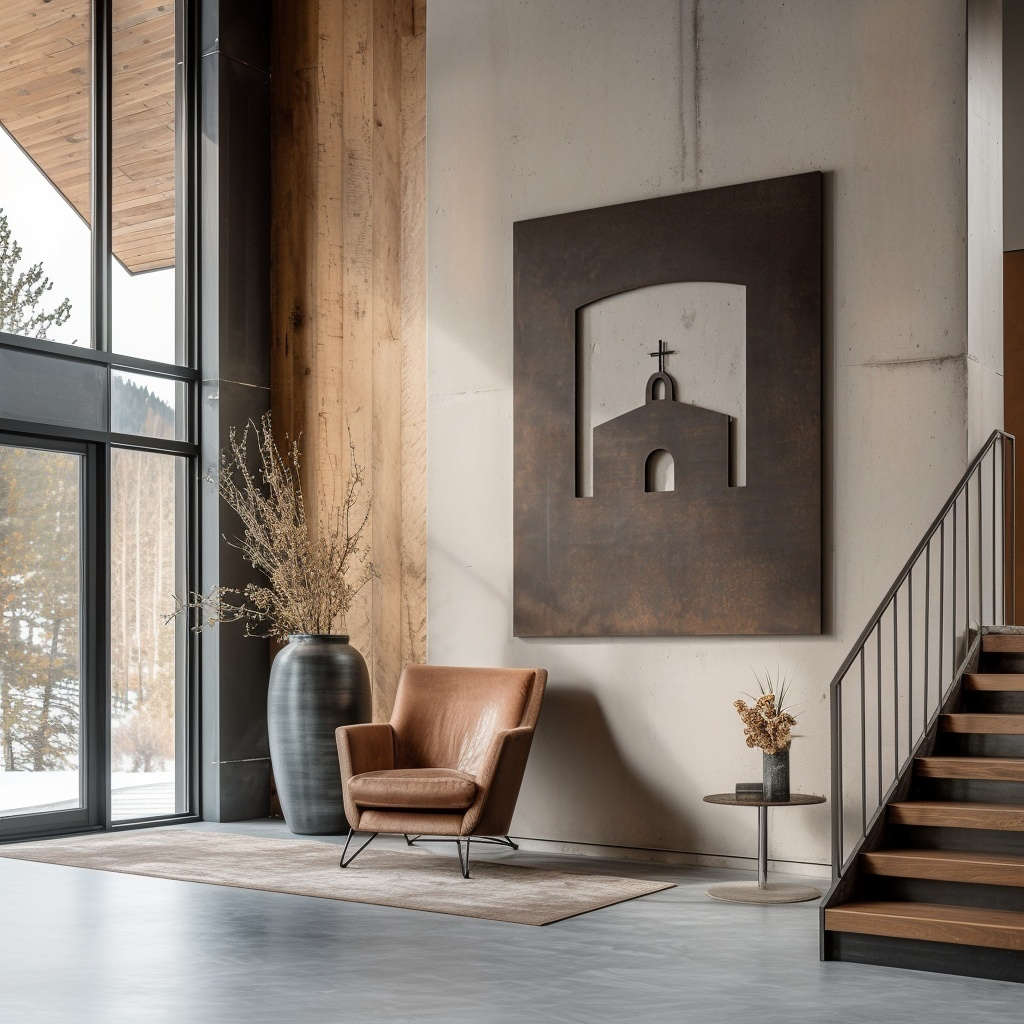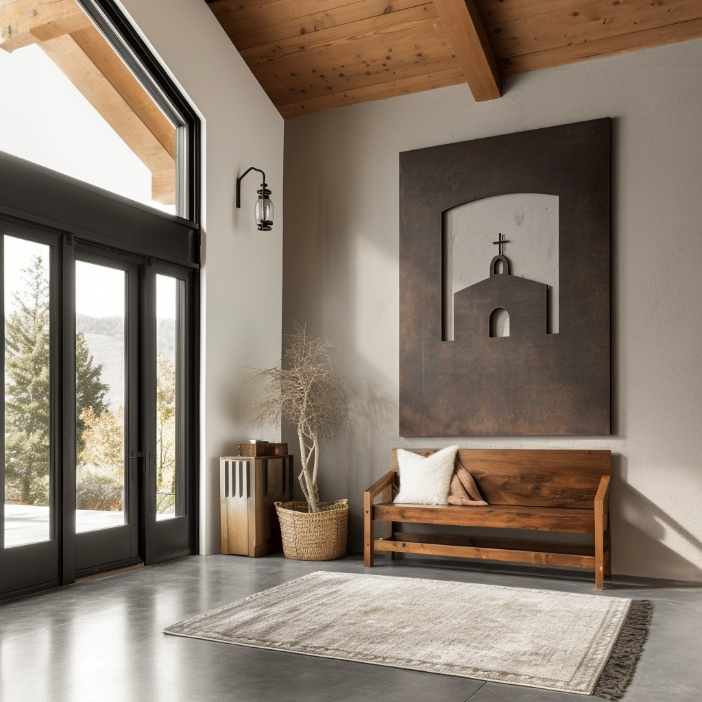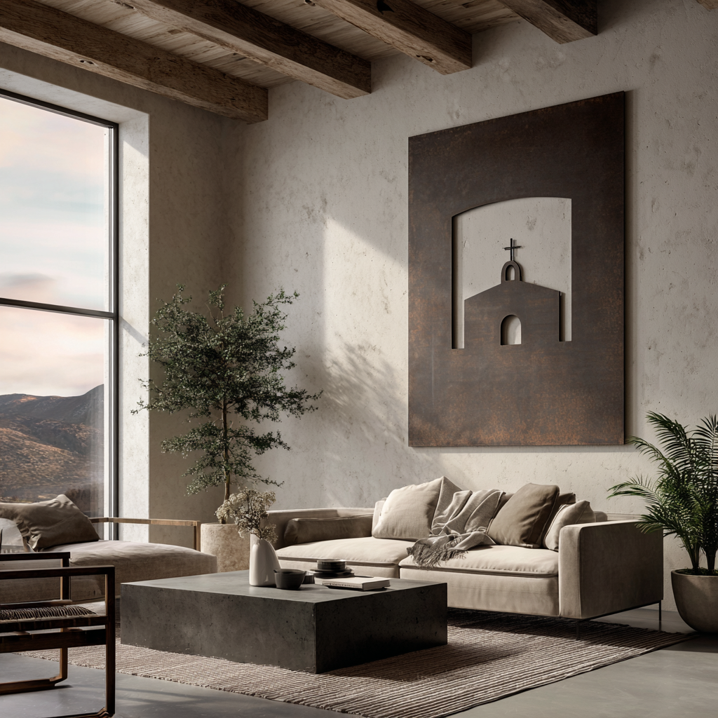 A simple bell tower, a rounded cross, and a roofline cut into steel. The Mission nods to old adobe sanctuaries and quiet desert towns. Places where the walls hold memory and the light moves slow.