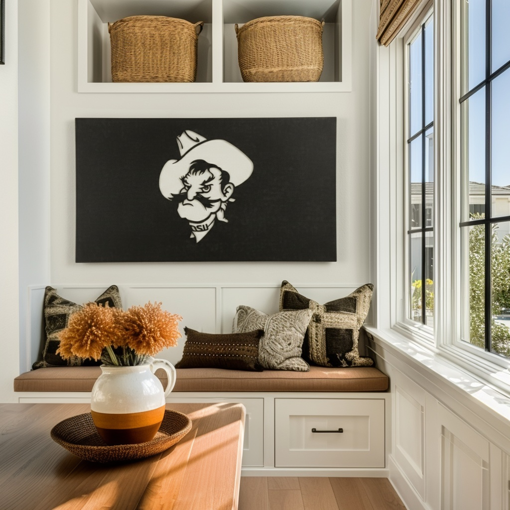 A bold tribute for devoted Cowboys fans, this steel-cut wall art showcases the iconic mascot with striking detail. Crafted from solid steel and mounted for depth, it casts a sharp shadow that makes the piece come alive in any space.