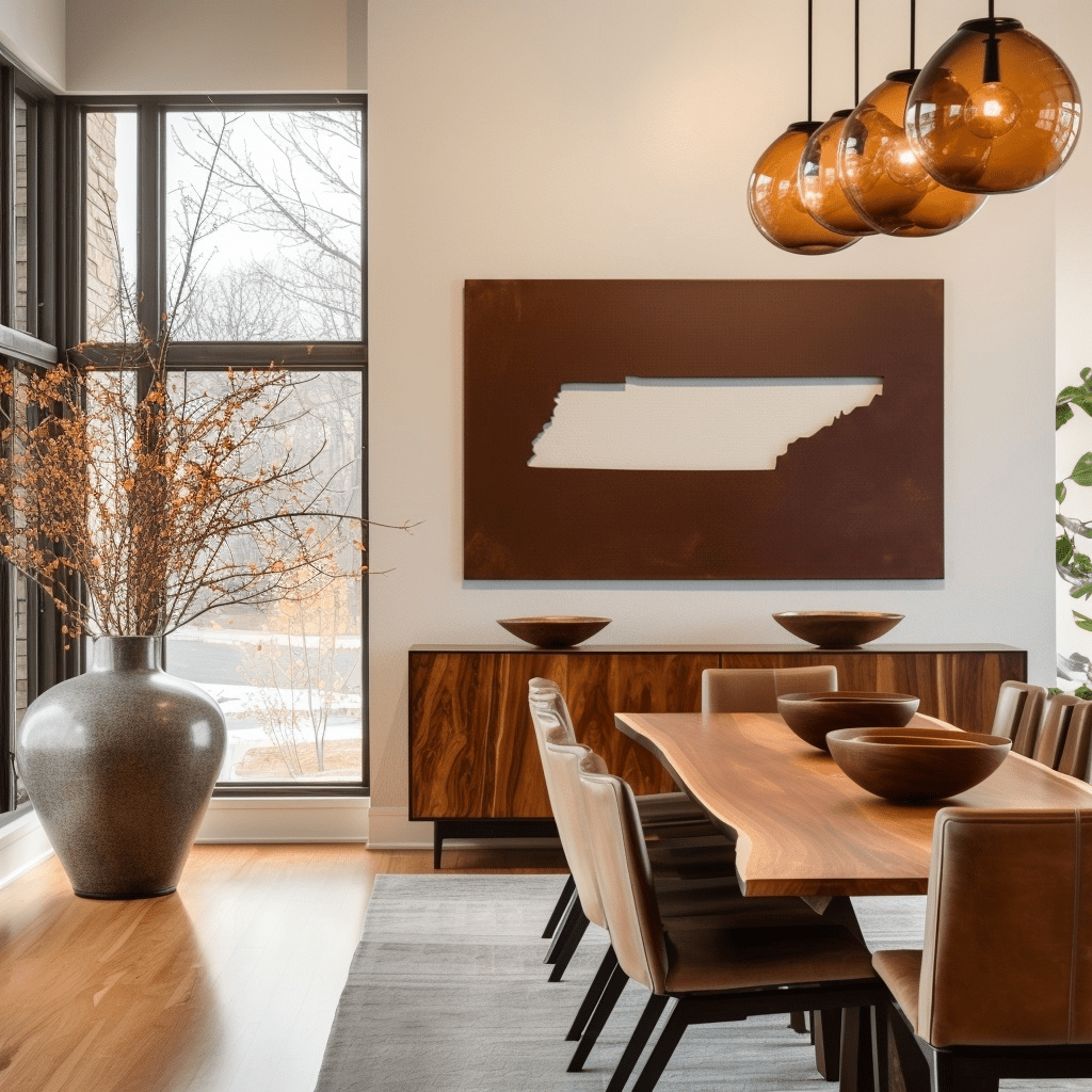The Tennessee captures the long, narrow stretch of a state shaped by ridges, rivers, and song. Its silhouette holds the rhythm of the Smokies to the east and the slow pulse of the Mississippi to the west, a landscape built on harmony and history.