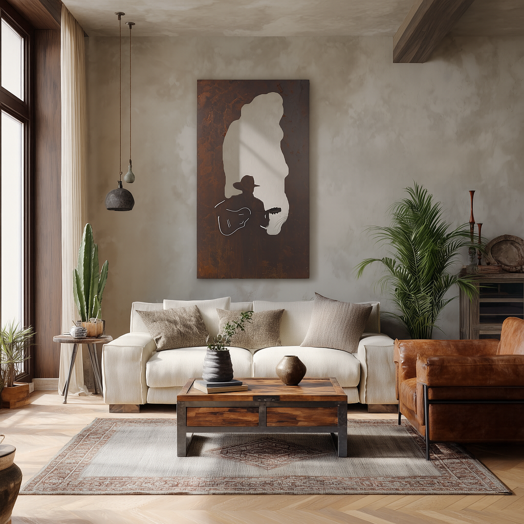 A cowboy with a guitar, mid-strum. The Troubadour captures a quiet moment of music on the frontier. The silhouette is cut through dark patinaed steel, letting the wall behind create natural contrast and rhythm. A piece that brings warmth, story, and soul to the room.