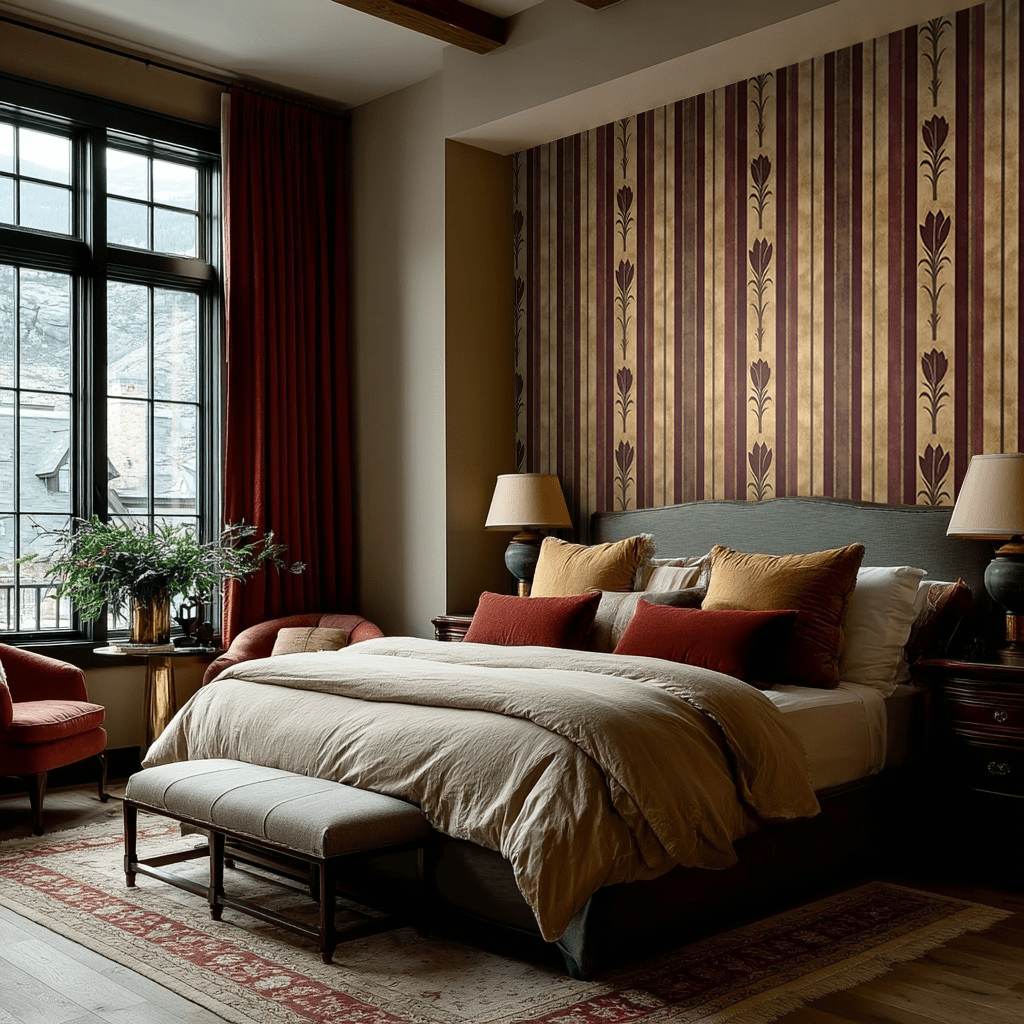 The Thelma Wallpaper is a bold, striped design with ornate floral accents in warm burgundy and beige tones. Its alternating pattern of solid and floral stripes makes it a versatile choice for both traditional and transitional spaces. Perfect for adding character to hallways or dining rooms, it offers a rich and elegant look. Complement it with gold or bronze accents for a cohesive design.