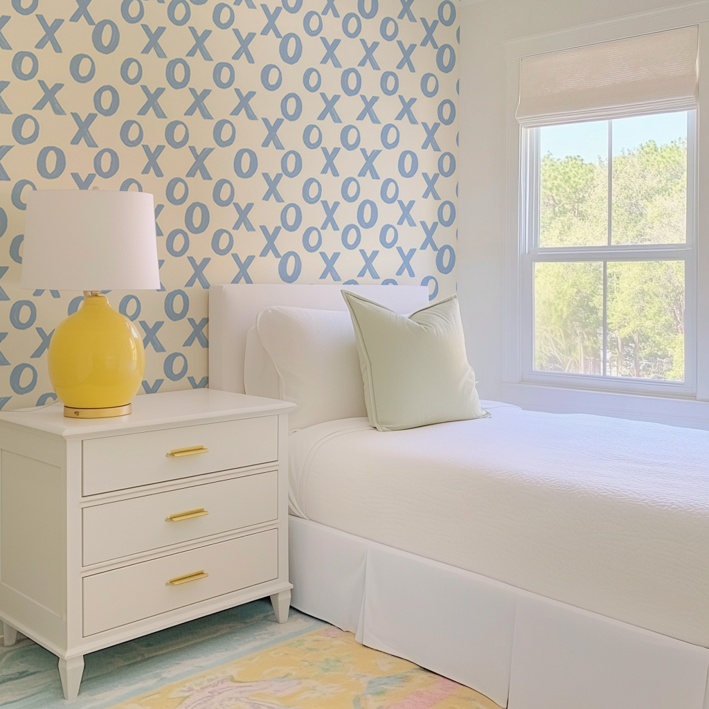 A twist on the classic grid, Tic Tac sets its Xs and Os slightly off-axis for a breezy, effortless look. Soft blue on ivory keeps things clean and casual—perfect for bedrooms, built-ins, or playful accent walls.