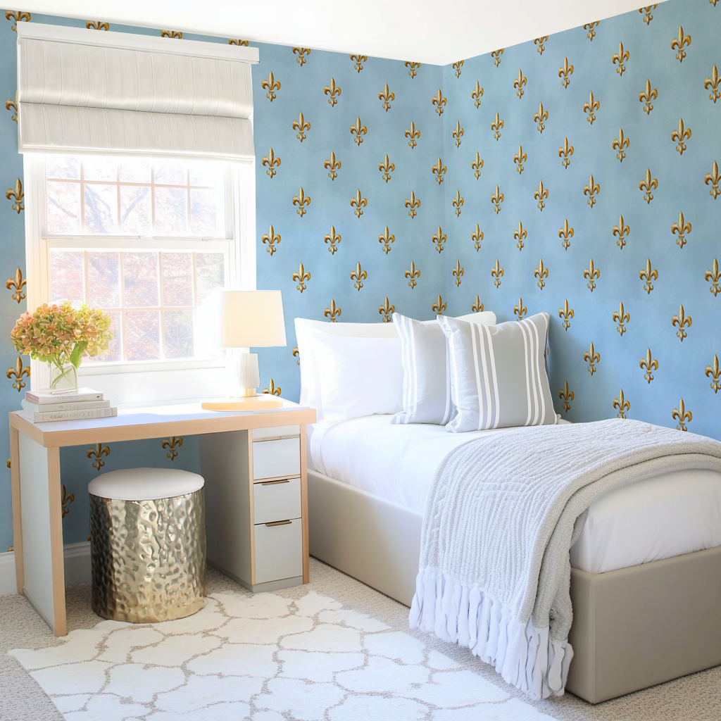 A soft blue field scattered with golden fleur-de-lis—effortlessly stately, yet still playful. For those who love tradition but never take it too seriously.
