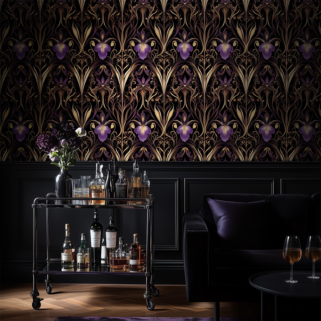 Velvet Iris is a moody, jewel-toned stunner featuring deep purple blooms and golden stems set against a midnight black backdrop. The sinuous lines and elegant irises nod to Art Nouveau elegance, bringing a seductive drama to any space. Ideal for bold powder rooms, dramatic dining areas, or anywhere that calls for a touch of opulence and mystery.