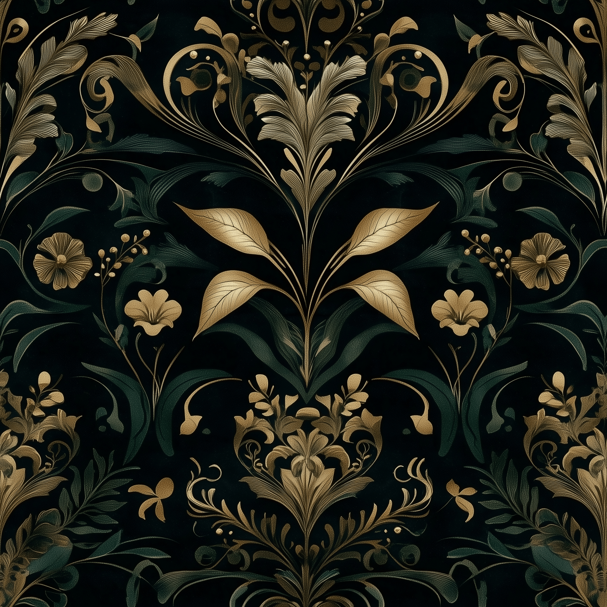 Verdessa is a lush tapestry of golden botanicals and deep emerald foliage set against a velvety black background, evoking a sense of regal mystique. The intricate design marries classical symmetry with wild garden elegance, bringing depth and richness to any space. Perfect for studies, powder rooms, or dramatic hallways, it offers timeless grandeur with a moody twist.