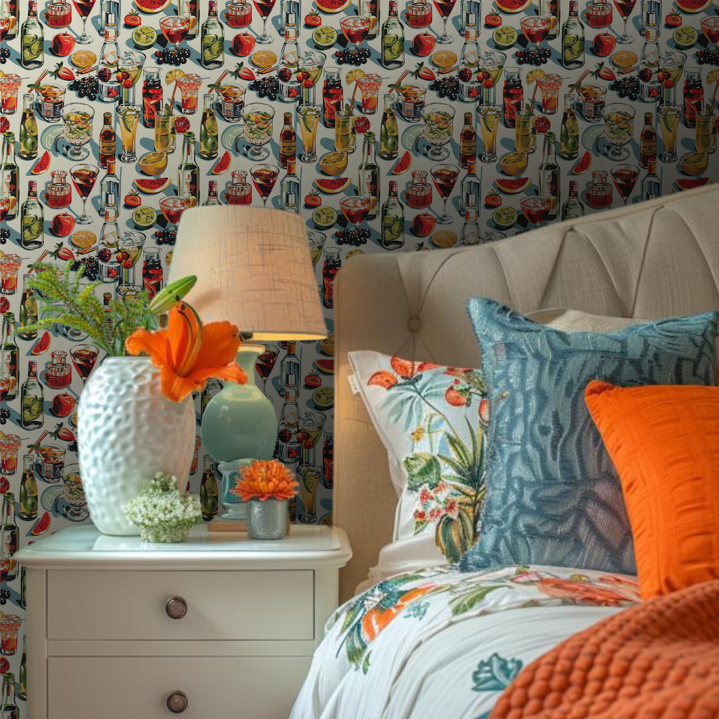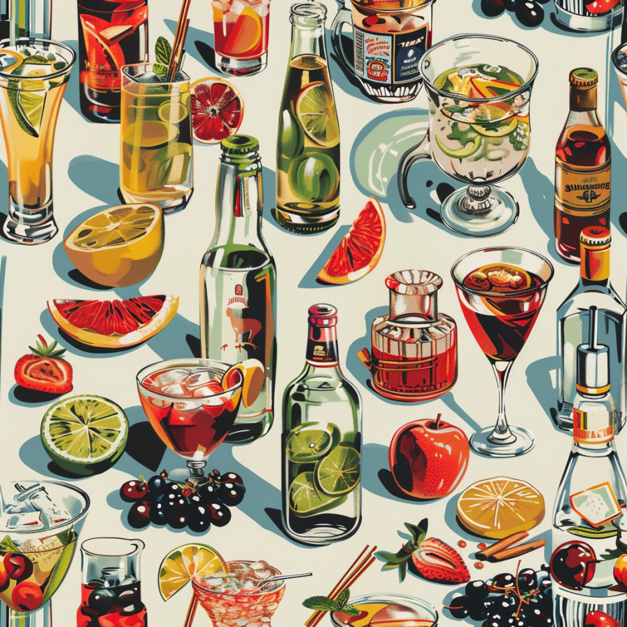 "Vivian's Verve" a cocktail connoisseur's dream, artfully capturing the zest of fresh fruit, the clink of ice, and the allure of vintage bottles. This vibrant wallpaper stirs up the essence of a bustling bar scene, perfect for adding a splash of spirited sophistication to any space.