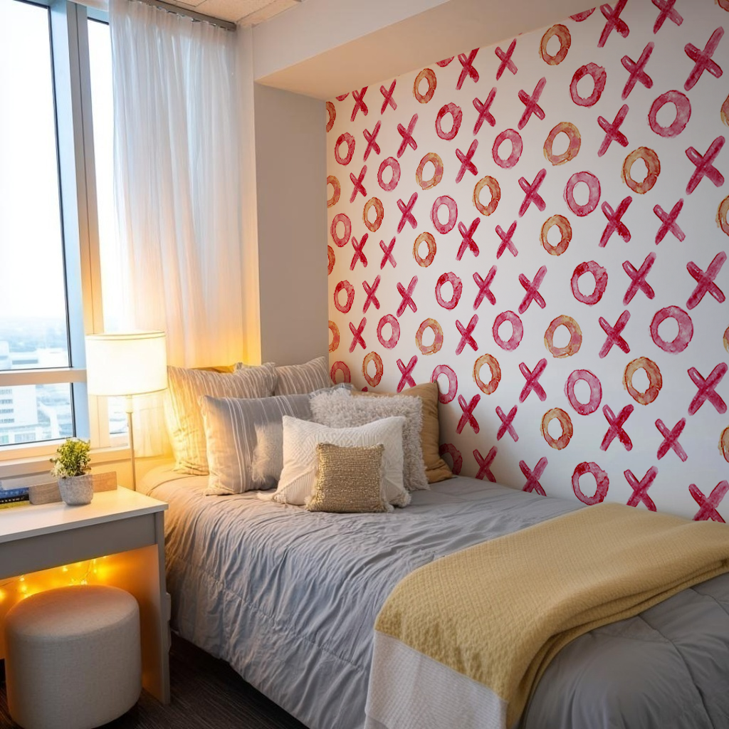 This warm, painterly pattern feels both playful and pretty. Watercolor Game uses soft reds and blush tones in a scattered XOXO repeat—bringing charm and a touch of whimsy to any space.