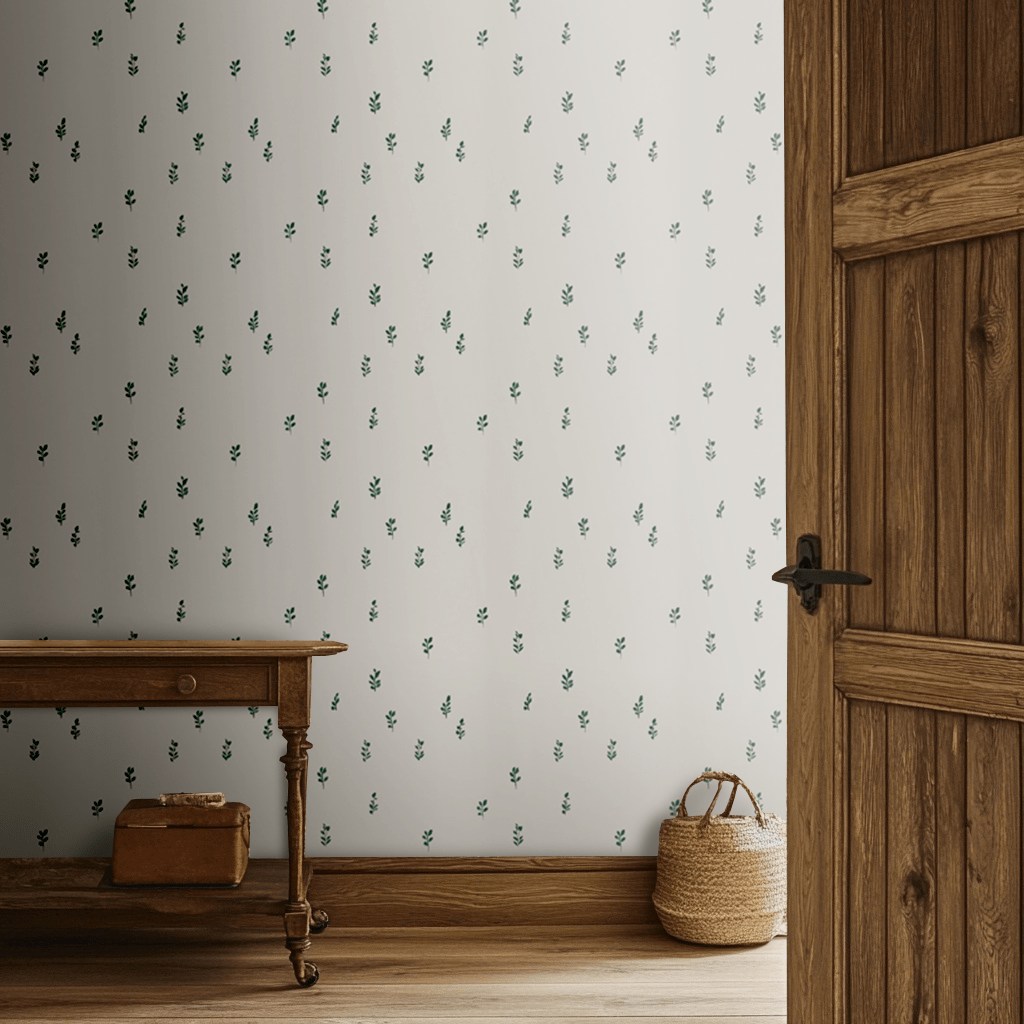 Westbrook is a study in simplicity, featuring delicate green sprigs spaced across a crisp white backdrop. Its airy, minimal design brings a breath of freshness to any space, pairing perfectly with both modern and traditional interiors.