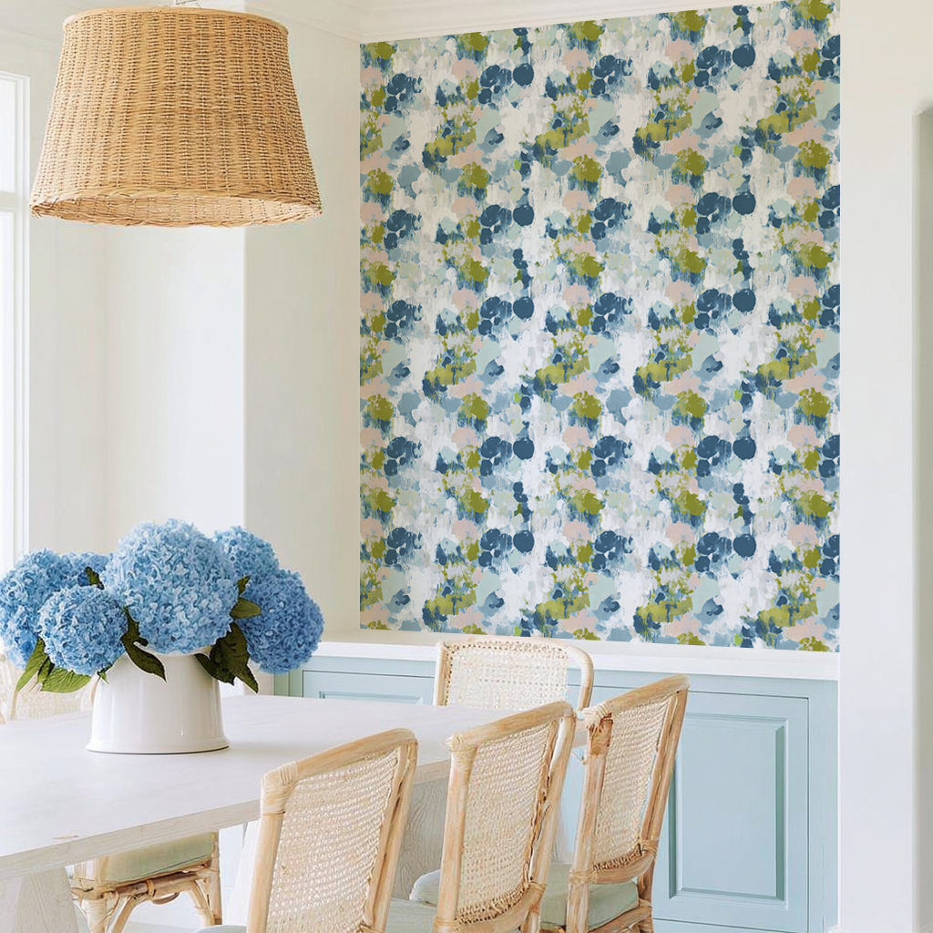 Wildflower Wash feels like a soft spring breeze in abstract form. Cloud-like brushstrokes in pastel blues and greens mingle with touches of blush pink, mint, sage, navy, and white. This seamless pattern delivers an ethereal wash of color, reminiscent of wildflowers swaying in the wind—perfect for light, dreamy interiors.